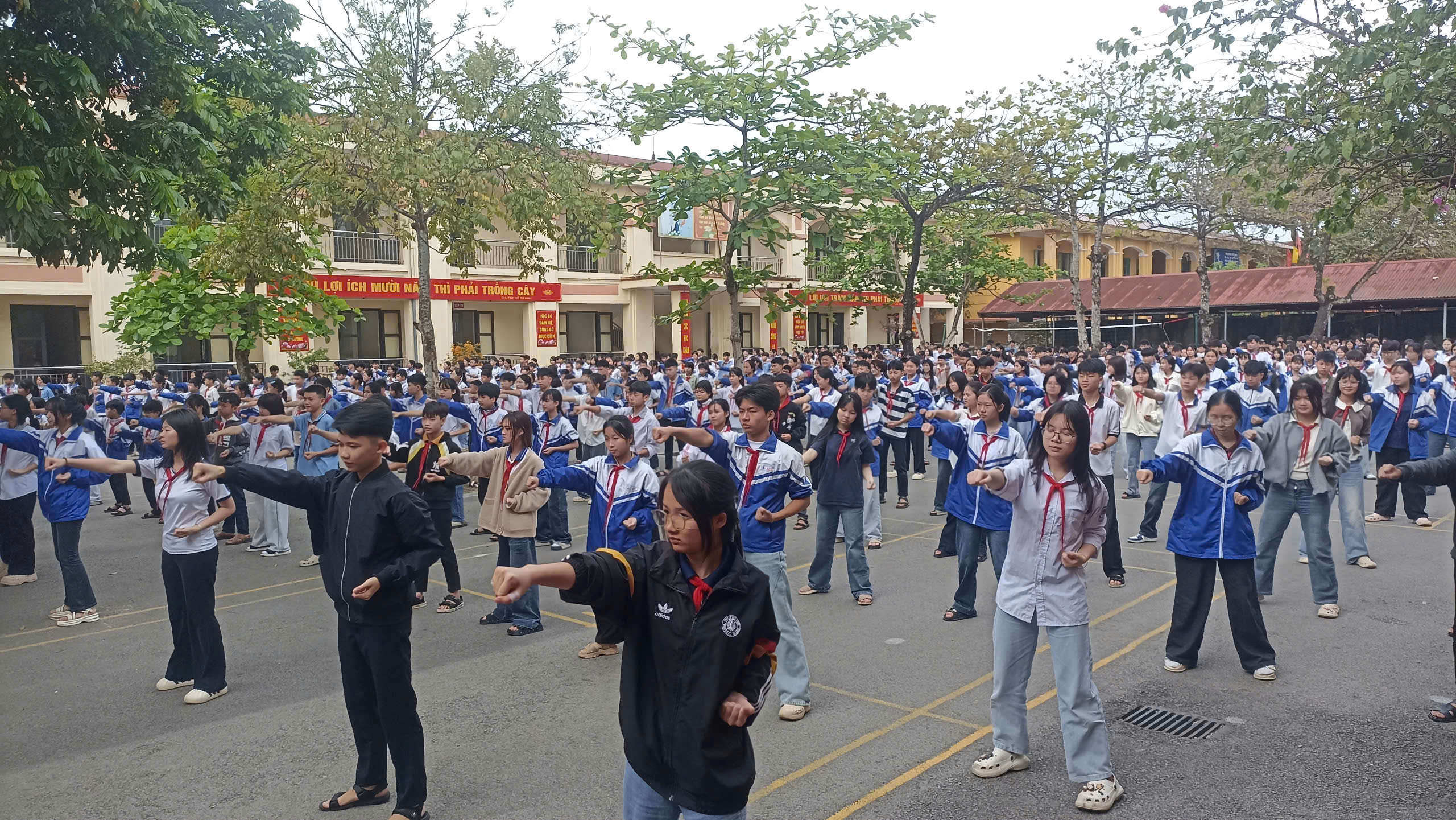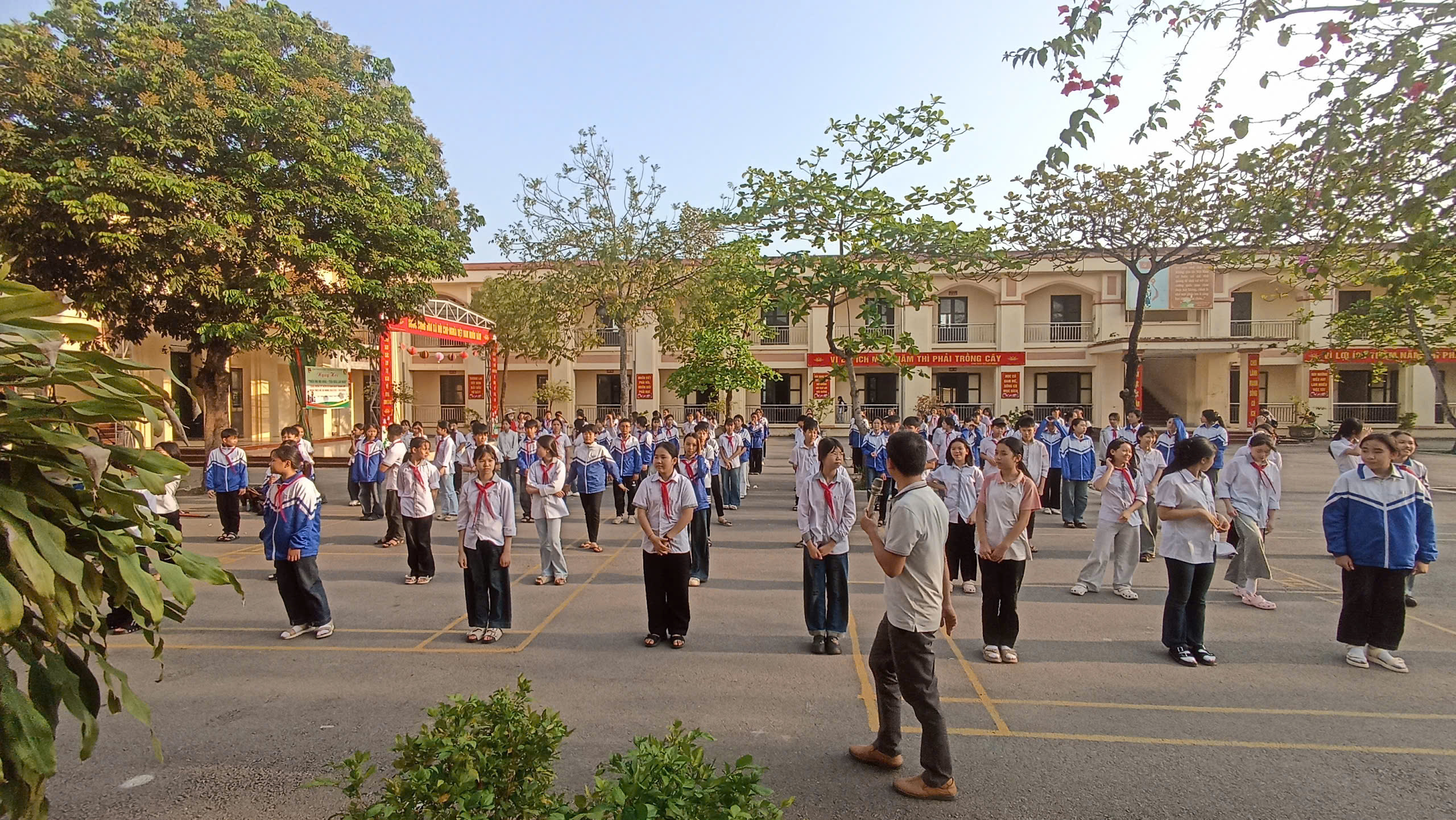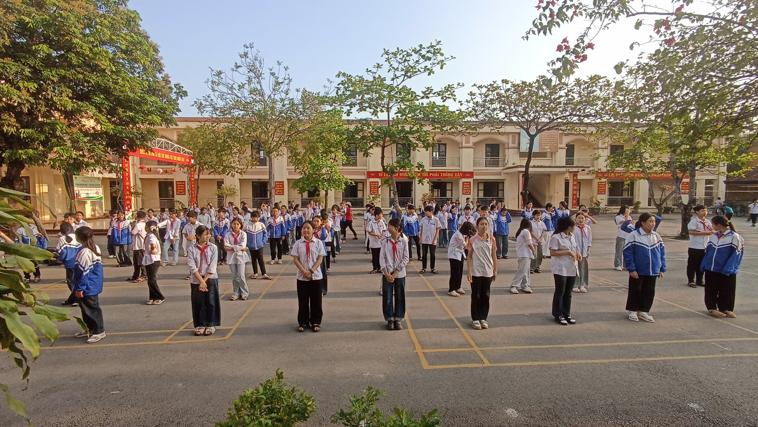 Những buổi tập luyện diễn ra trong bầu không khí khẩn trương nhưng đầy hào hứng. Dù thời tiết có lúc nắng nóng, các em vẫn miệt mài luyện tập với tinh thần trách nhiệm cao. Tiếng hô nhịp, tiếng bước chân đều đặn và những nụ cười rạng rỡ đã tạo nên một khung cảnh sinh động, tràn đầy sức trẻ trên sân trường.